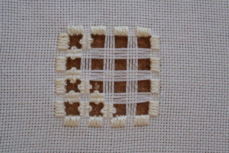 kloster blocks) are worked at intervals to enclose an area after which section of ground fabric can be removed. the remaining grid of threads can then be bound and enhanced. I am really pleased with the part worked square sample but struggled with the stepped piece.